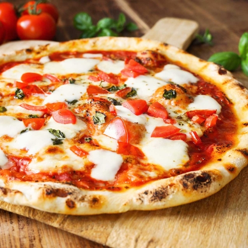 Pizza Margherita is a timeless Italian classic that celebrates simplicity and fresh ingredients. It features a thin, airy crust spread with vibrant tomato sauce, topped with creamy mozzarella and fragrant basil leaves.