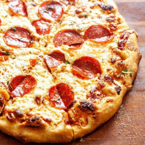 Pepperoni pizza is a beloved classic that combines a flavorful tomato sauce, melted mozzarella cheese, and generous slices of spicy pepperoni atop a warm, golden crust.